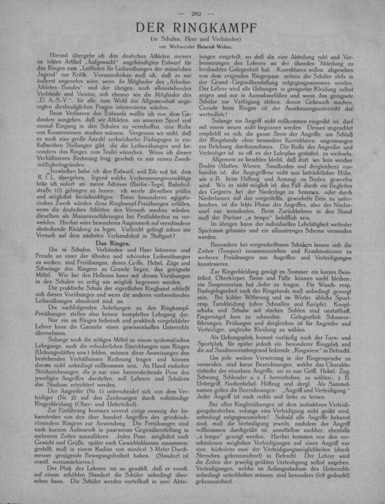 Heinrich Weber: Der Ringkampf (In Schulen, Heer und Verbänden), in: Deutsche Athletik. Sportzeitung, Stuttgart, 2. Jhg / Nr. 30, 27. Juli 1920, S. 282, [Fragment]; Sammlung privat