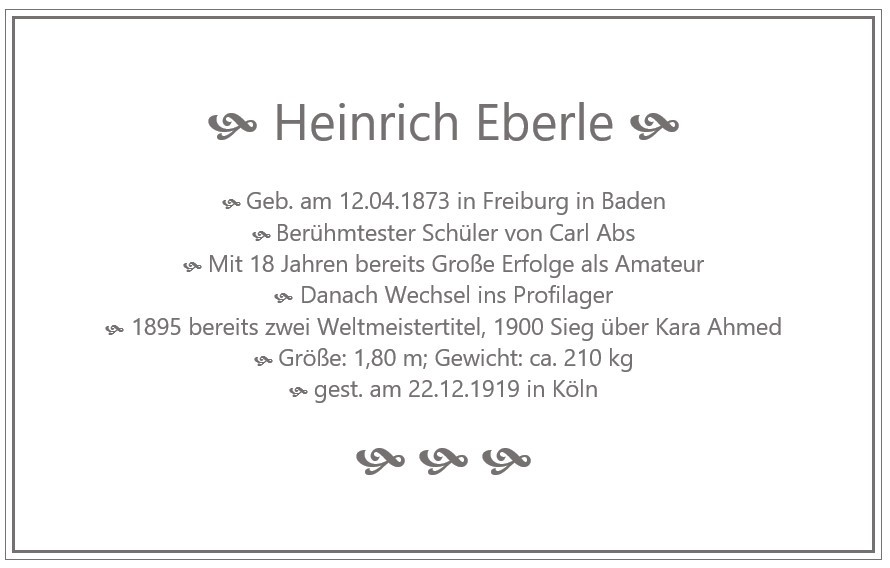 [1] Heinrich Eberle (geb. am 14.04.1873 in Köln; gest. am 22.12.1919) wurde von Karl Abs trainiert. Vgl. WRESTLINGDATA.COM.